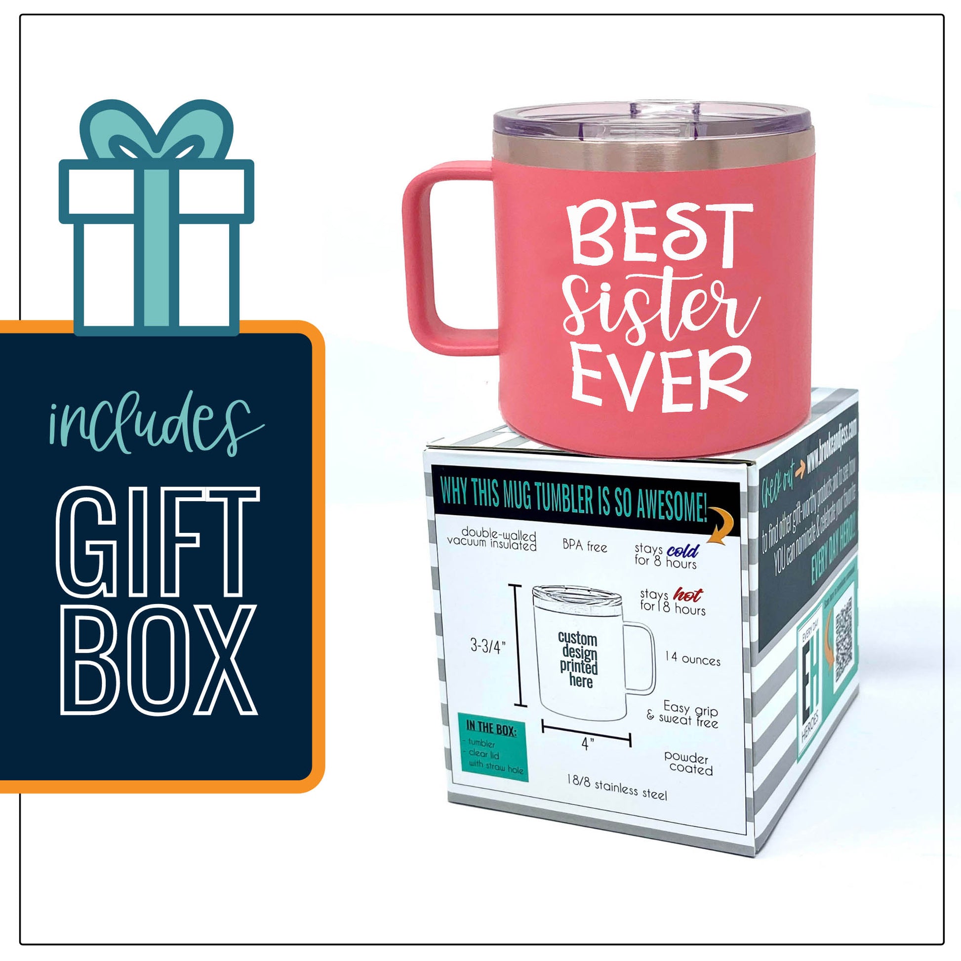 This cute, custom designed, stainless steel coffee mug tumbler is the perfect gift for your favorite sister, aunt, friend and more! Size is 14 oz and it is vacuum insulated so it will keep drinks hot and cold for hours! Coffee Mug travel tumbler is powder coated in the color coral and then the cute saying “Best Sister Ever” is screen printed on front in black print.