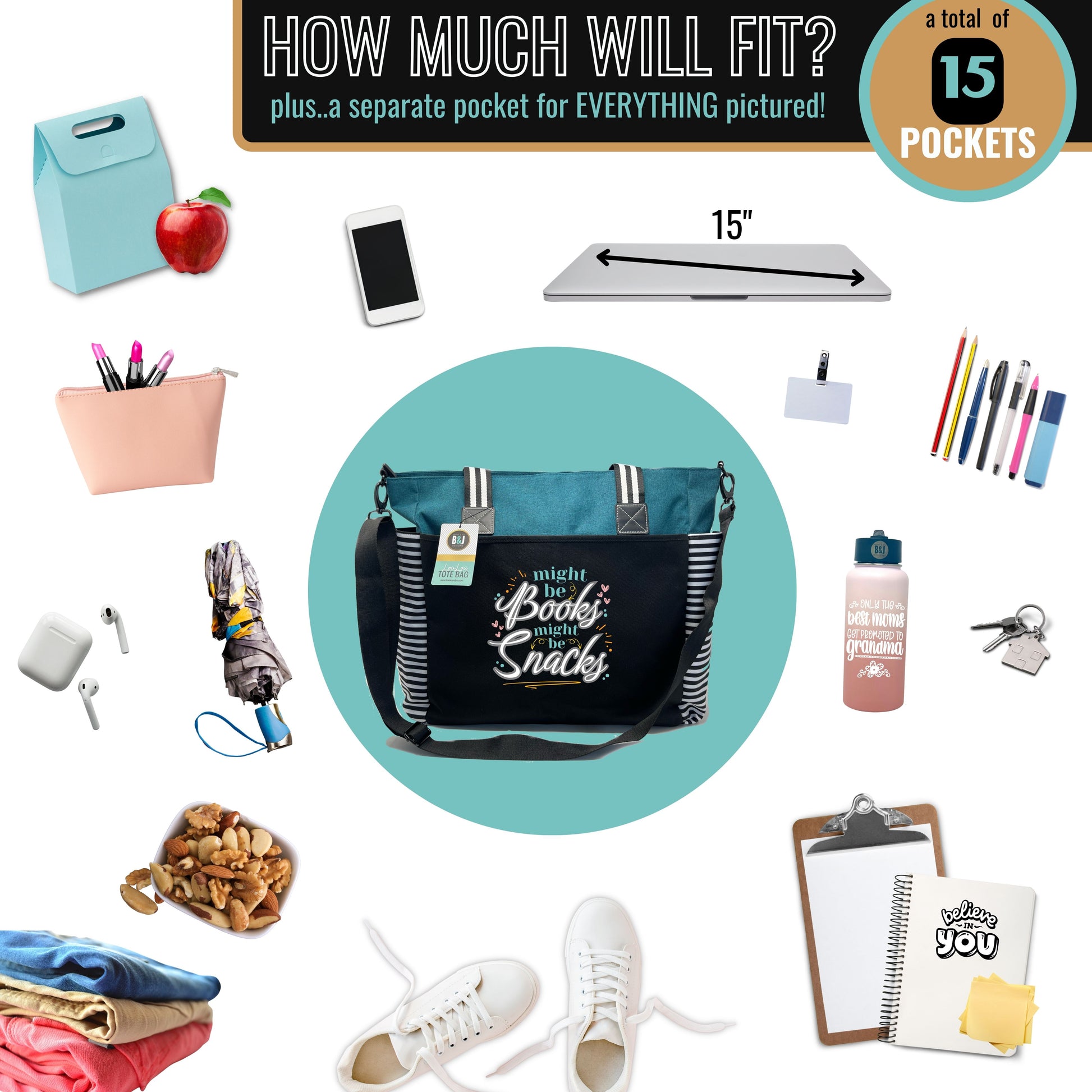Show your favorite person some love with this cute, fun, unique custom tote bag designed especially for your favorite woman. Dimensions of this bag are 18.5' x 15.5”' X 5.5'' - Has enough room for all of your essential teaching supplies and more! Includes a total of 15 POCKETS! These include, a zipper main compartment, a HUGE front sleeve deep pocket (fits up to an 11” tablet) that has 3 mesh pockets inside of it, 2 tall side water bottle accessory pockets, a zippered pocket inside, 3 organizational compartments inside and 2 slash pockets on the back that also have zippered pockets on the outside of each of them!