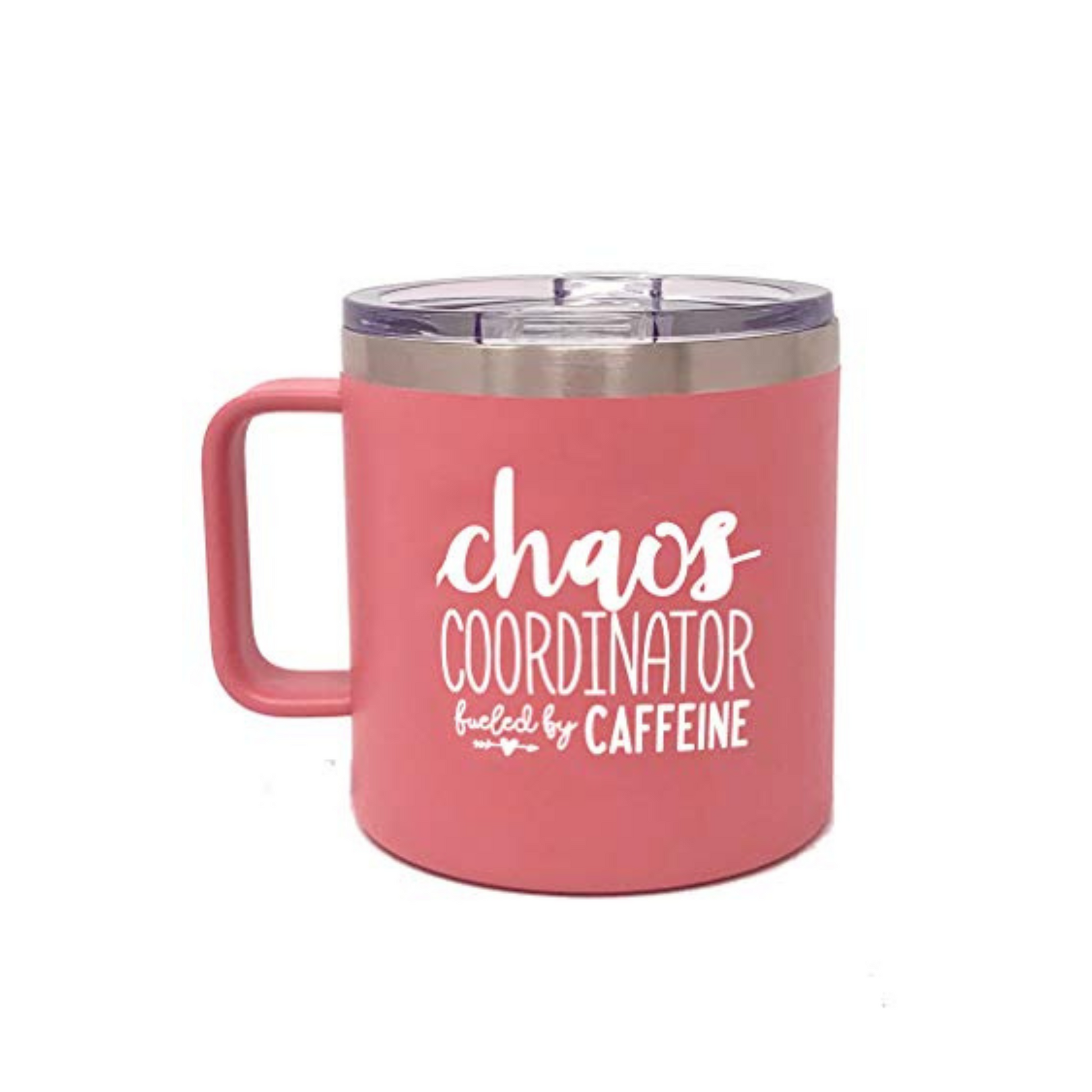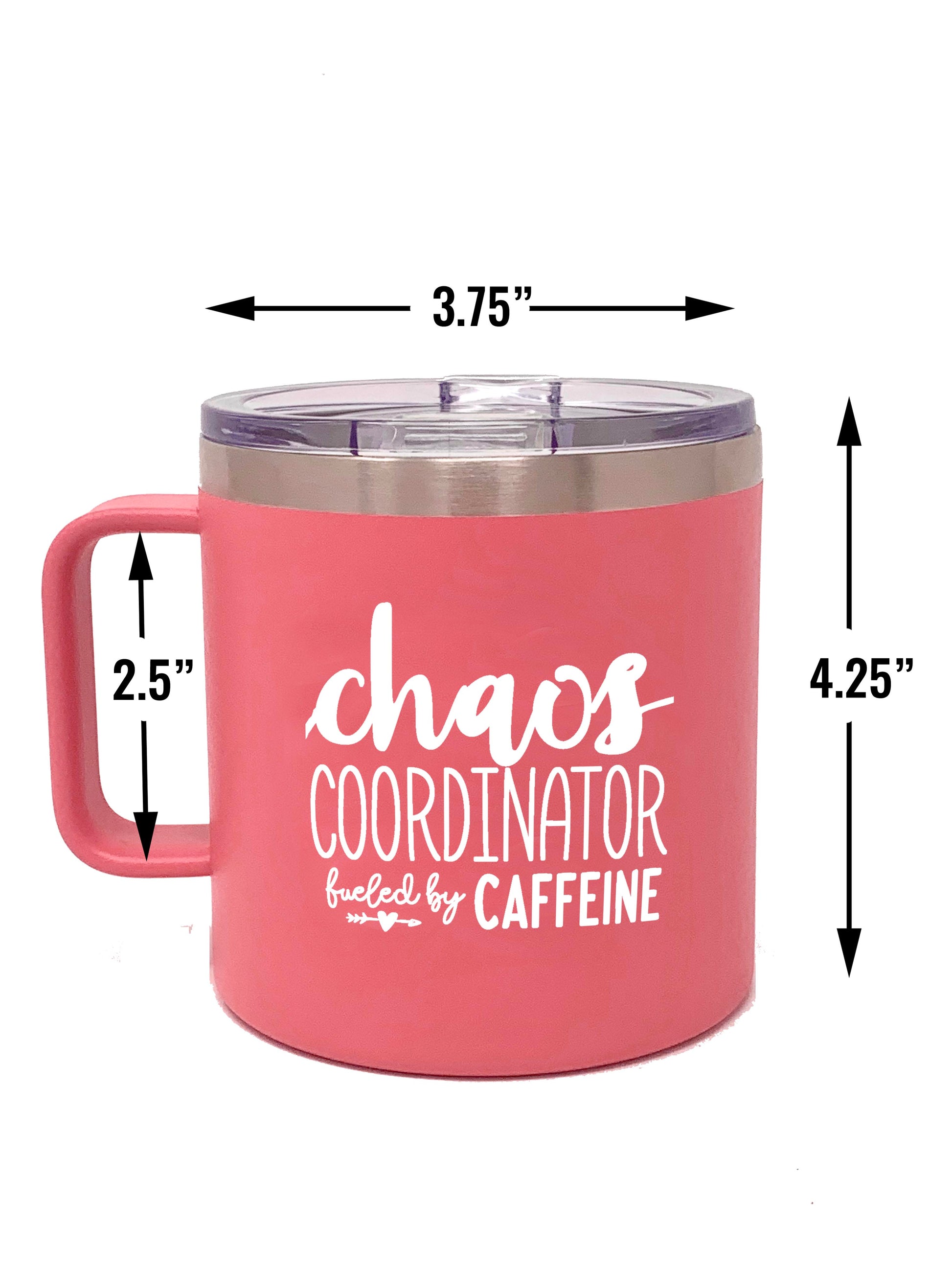 This cute, custom designed, stainless steel coffee mug tumbler is the perfect gift for your favorite woman, girlfriend, boss, coworker, teacher, nurse, mom, wife and more! Size is 14 oz and it is vacuum insulated so it will keep drinks hot and cold for hours! Coffee Mug travel tumbler is powder coated in the color coral and then the funny saying “Chaos Coordinator Fueled by Caffeine” is screen printed on front in white print. Care instructions: HAND WASH ONLY. Do not use in microwave or dishwasher