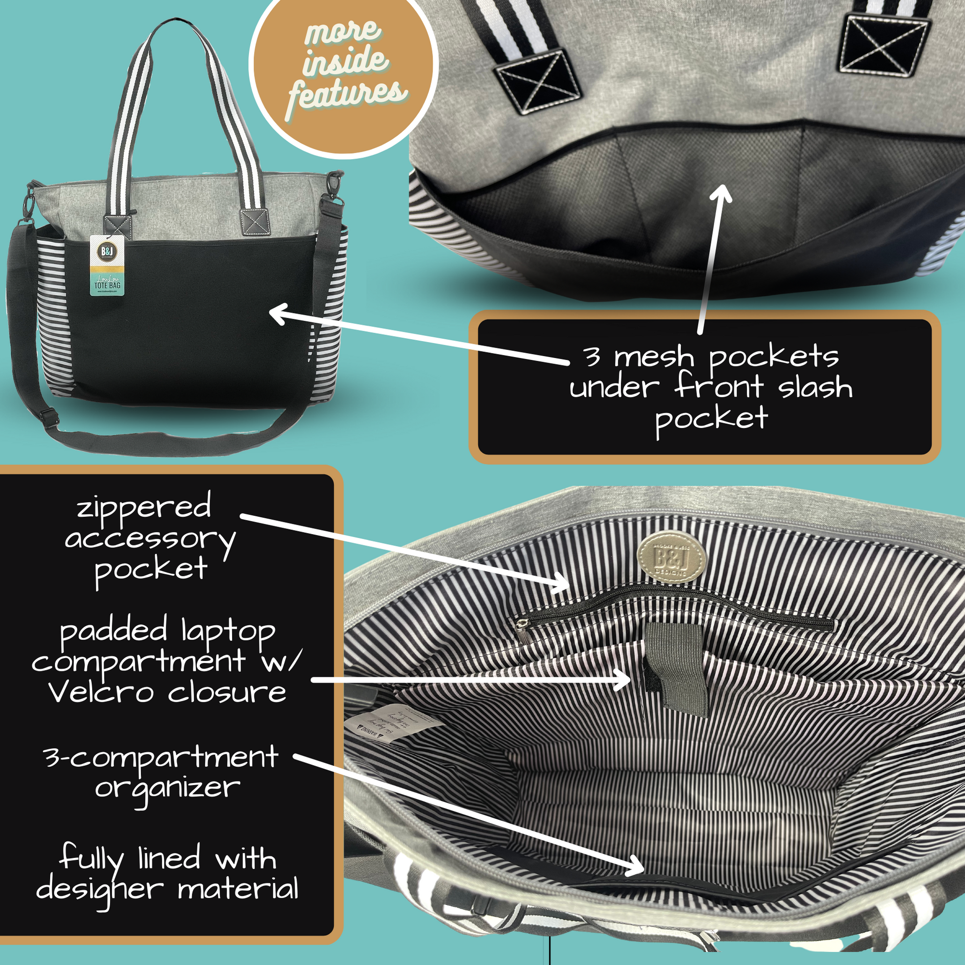 With a total of 15 pockets in all the right places, the LouLou tote rightly deserves the title of "Ultimate Tote." You'll stay more organized and look good doing it! Plus, the removable adjustable shoulder strap makes carrying a breeze! :)