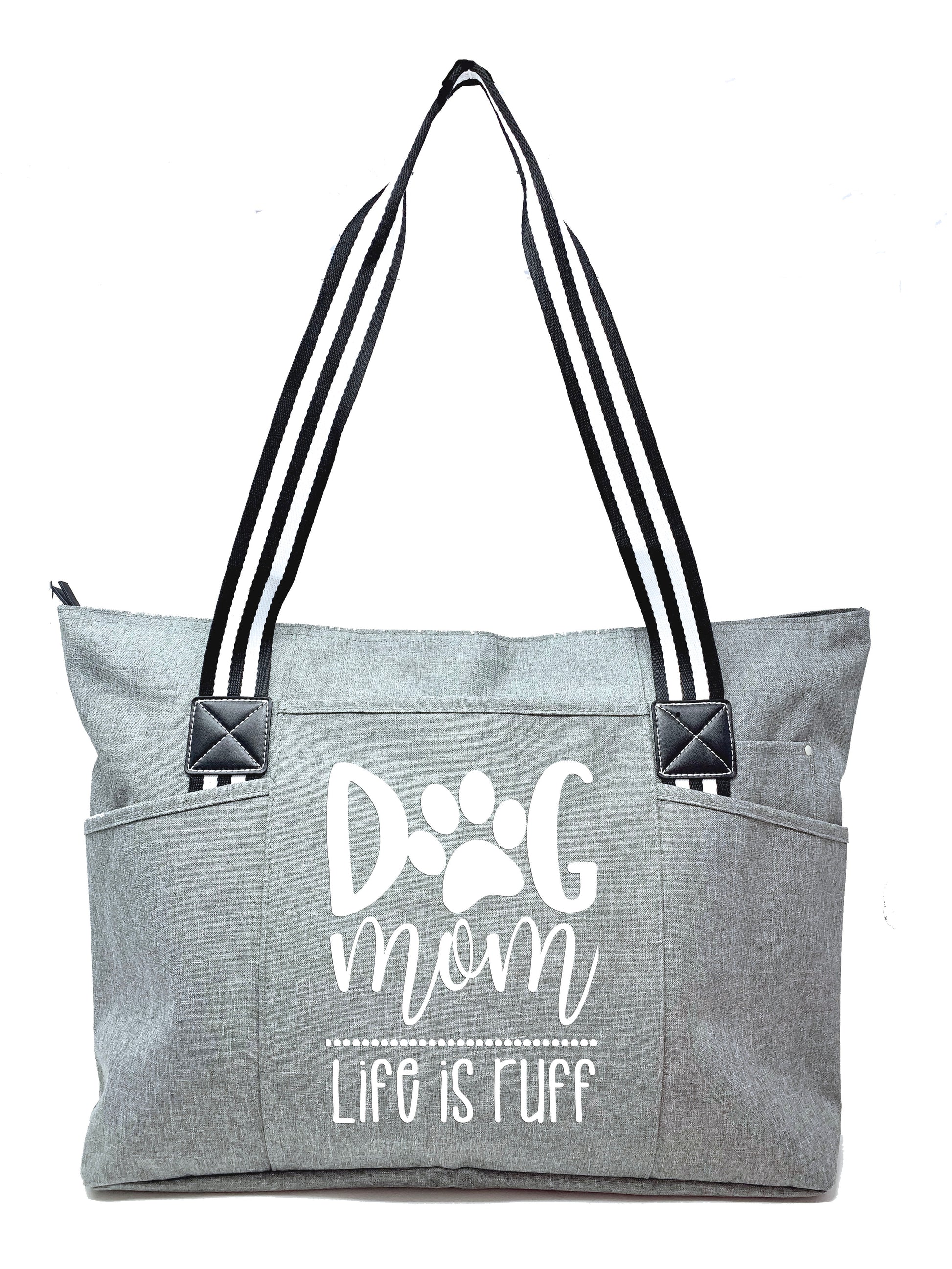 Show your favorite Dog Mom some love with this cute, fun, unique custom tote bag designed especially for moms. Has a cute Dog Mom Life is Ruff graphic screen printed on the front pocket of the bag. Dimensions of this bag are 20'' X 13.5'' X 5.5'' - Has enough room for all of your belongings and more! Includes a zippered main compartment, a front sleeve deep pocket (fits up to an 11” tablet), 2 side water bottle accessory pockets, a zippered pocket inside and 3 organizational compartments inside!