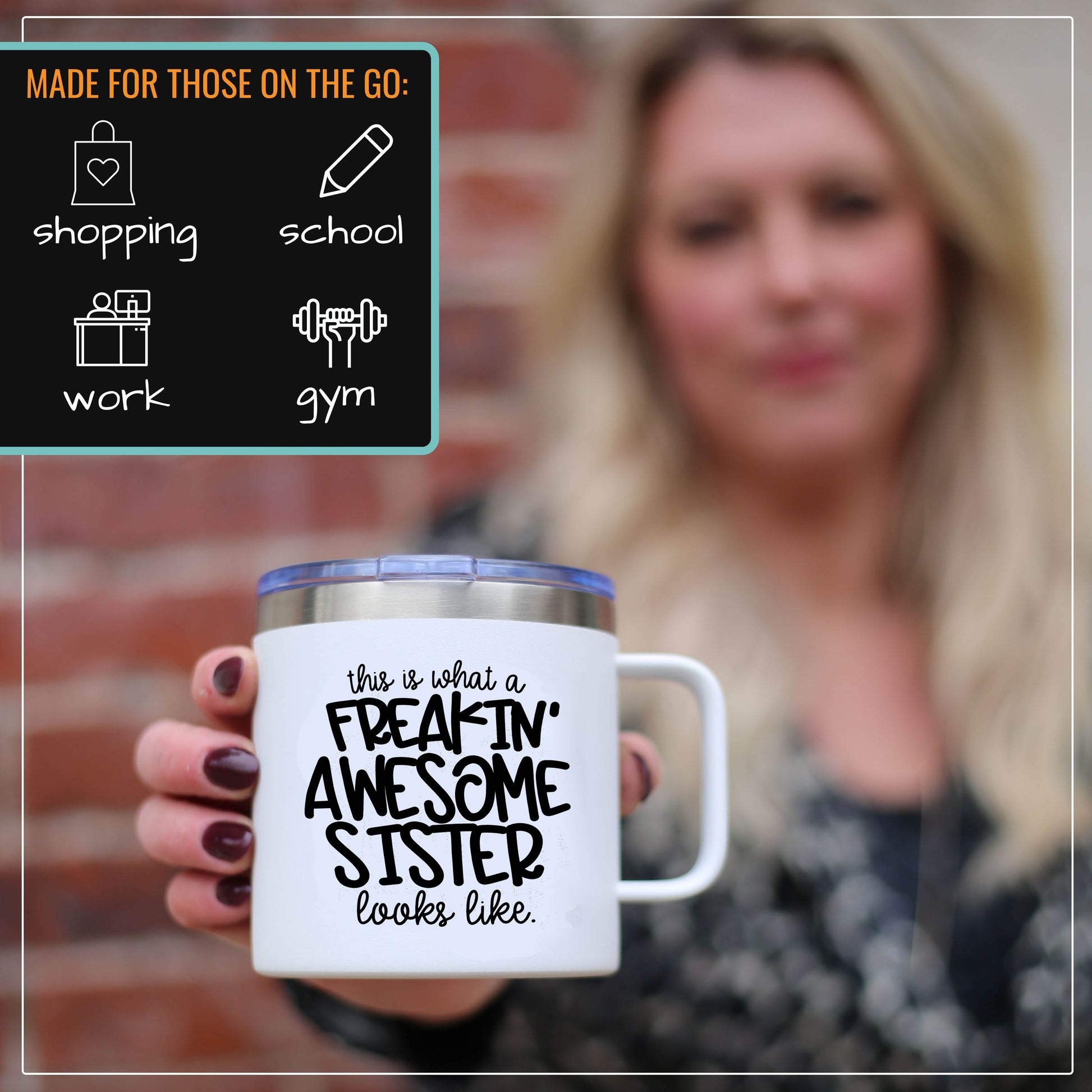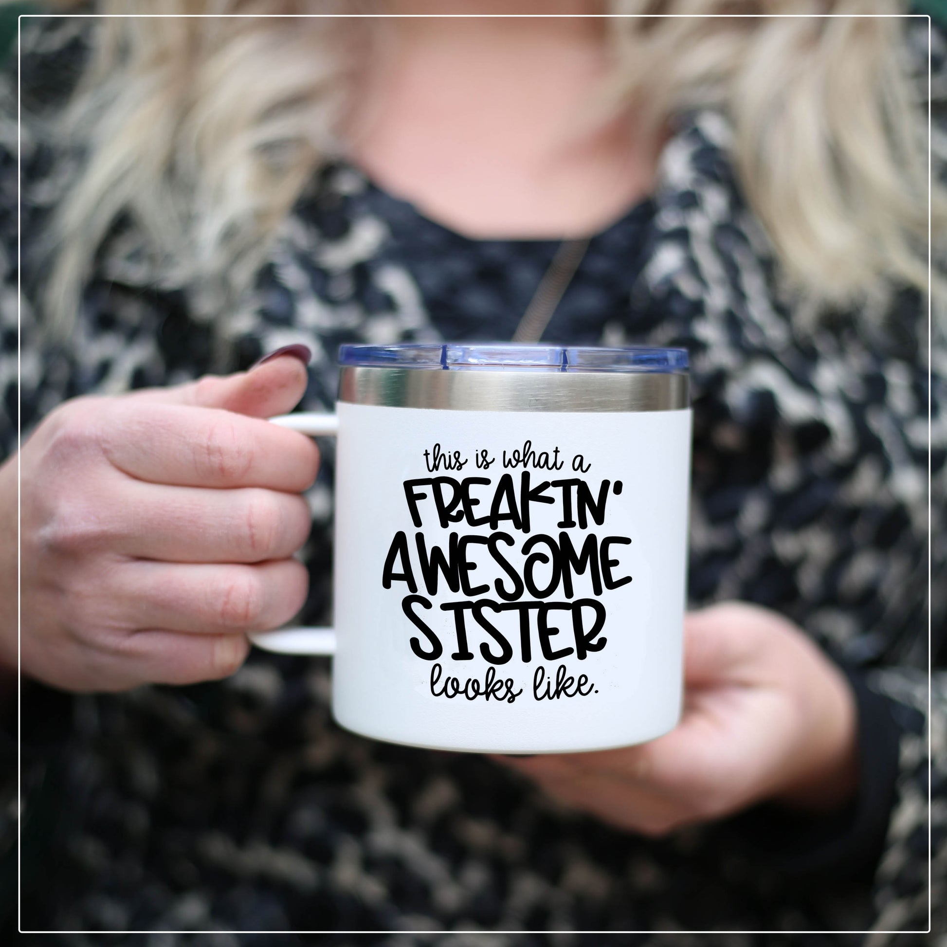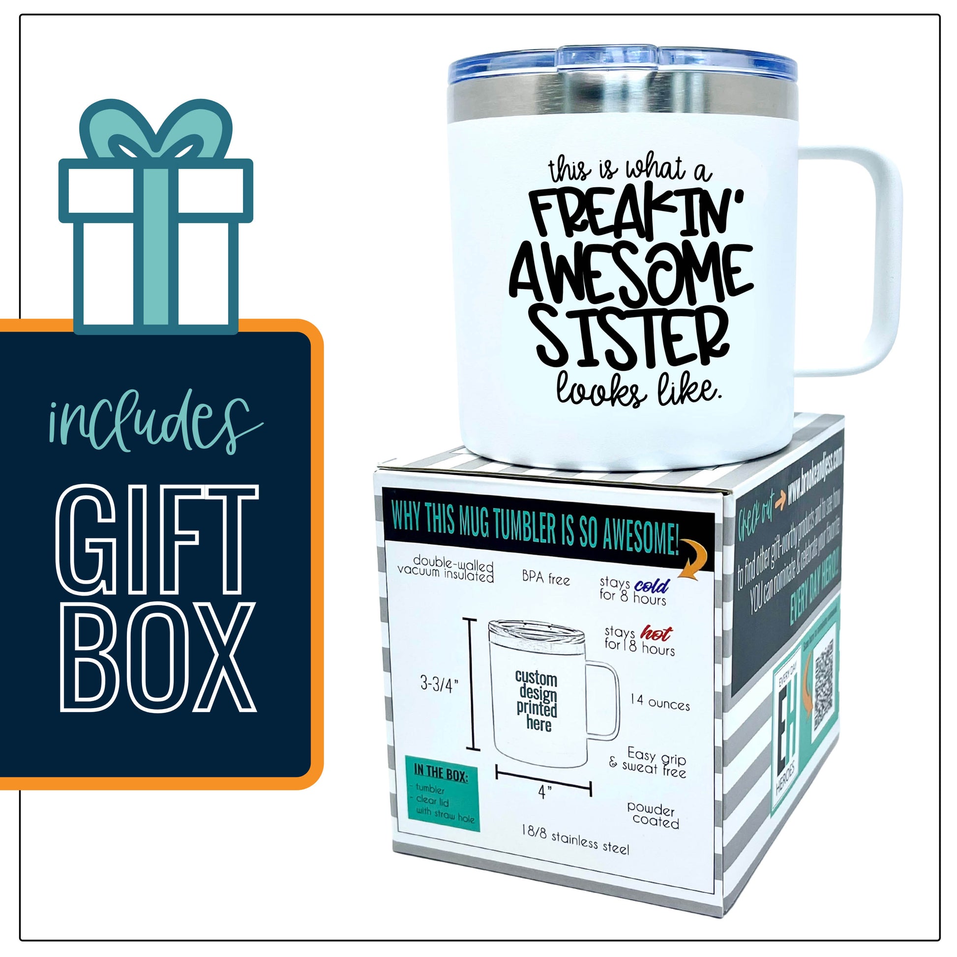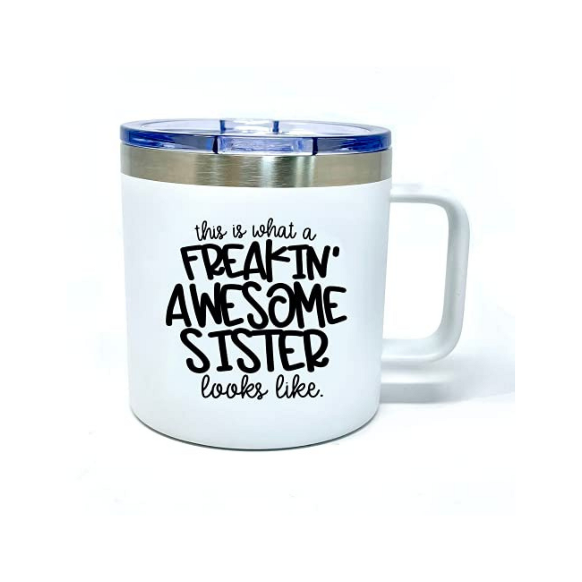 This cute, custom designed, stainless steel coffee mug tumbler is the perfect gift for your favorite sister, friend and more! Size is 14 oz and it is vacuum insulated so it will keep drinks hot and cold for hours! Coffee Mug travel tumbler is powder coated in the color white and then the funny saying “This is What a Freakin' Awesome Sister Looks Like” is screen printed on front in black print.