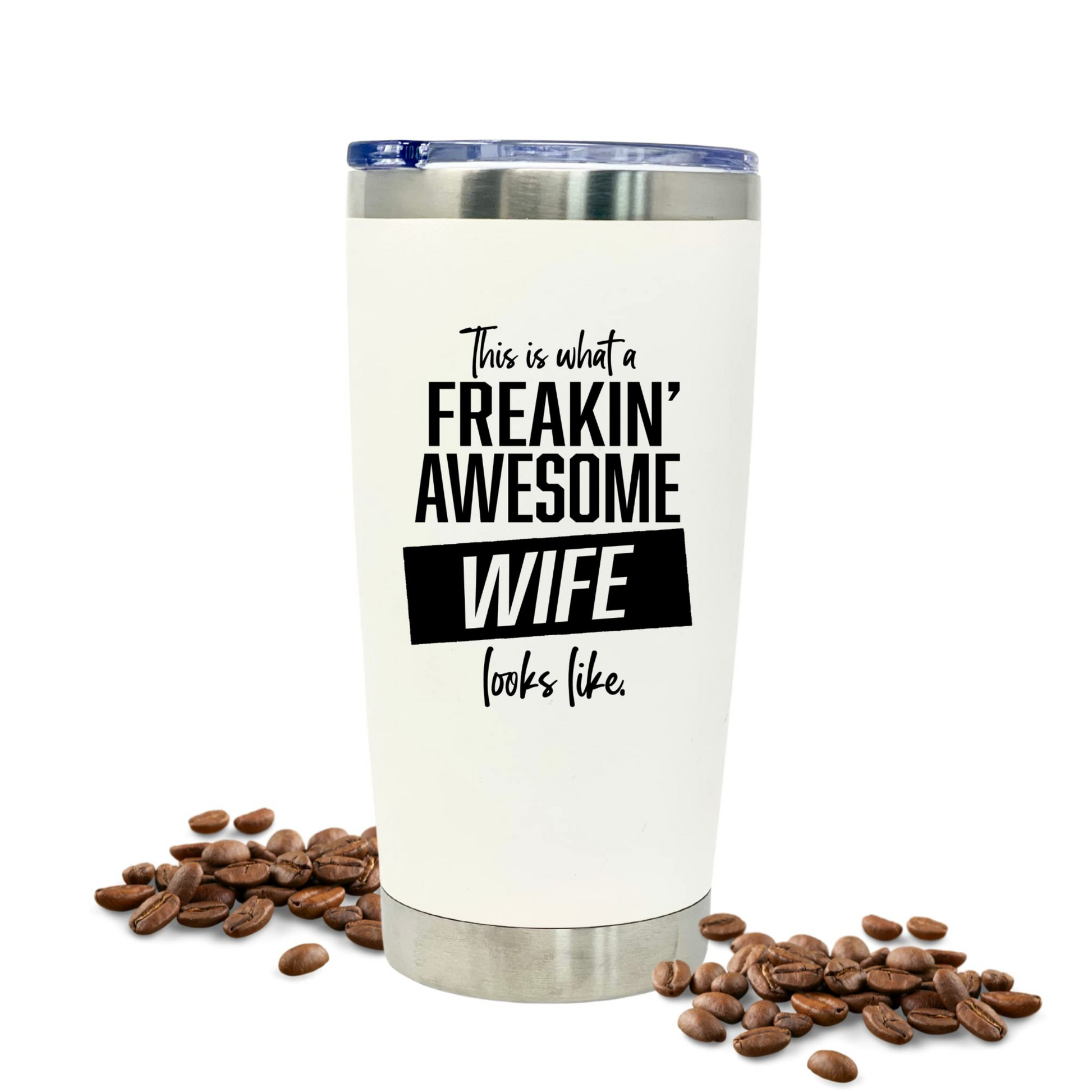 This funny, custom designed stainless steel tumbler is the perfect gift for your favorite wife. Size is 20 oz and it is vacuum insulated so it will keep drinks hot and cold for hours! Travel tumbler is powder coated in the color Black and then the funny saying “This is what a Freakin' Awesome Wife looks like” is screen printed on front in black print.