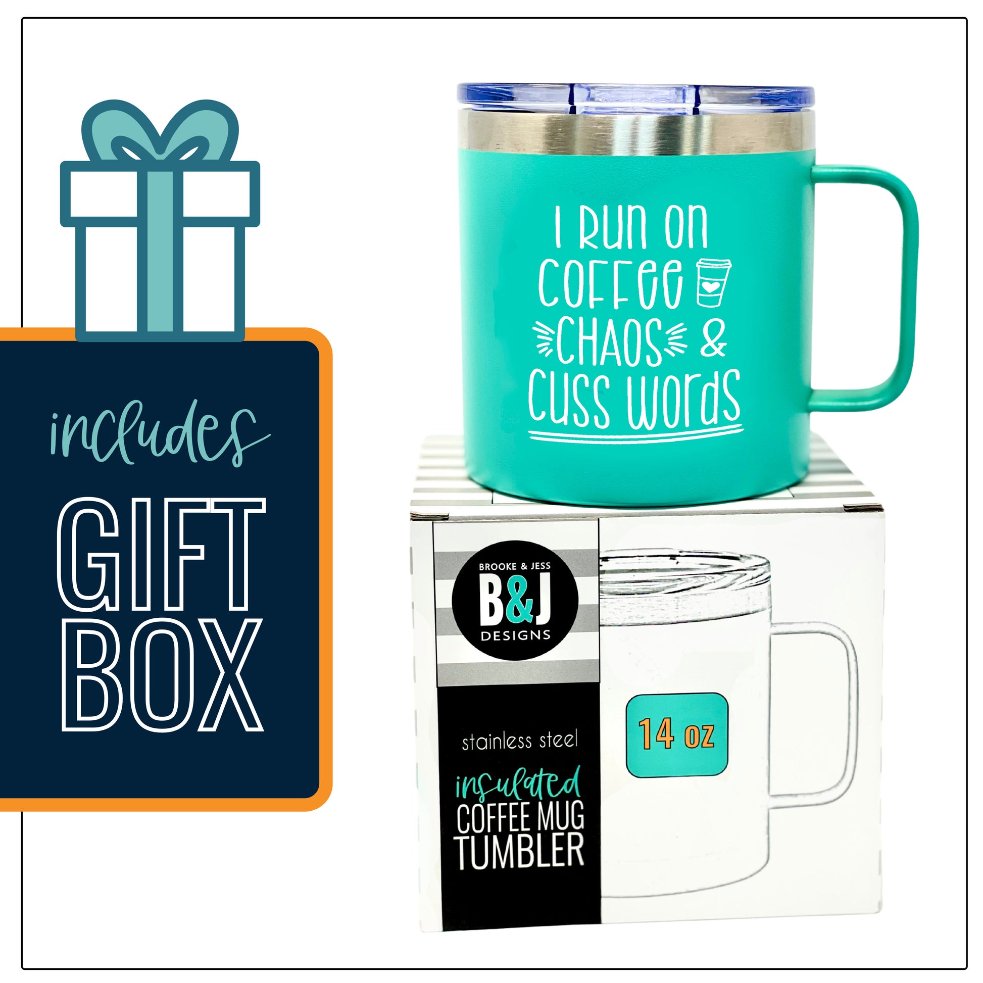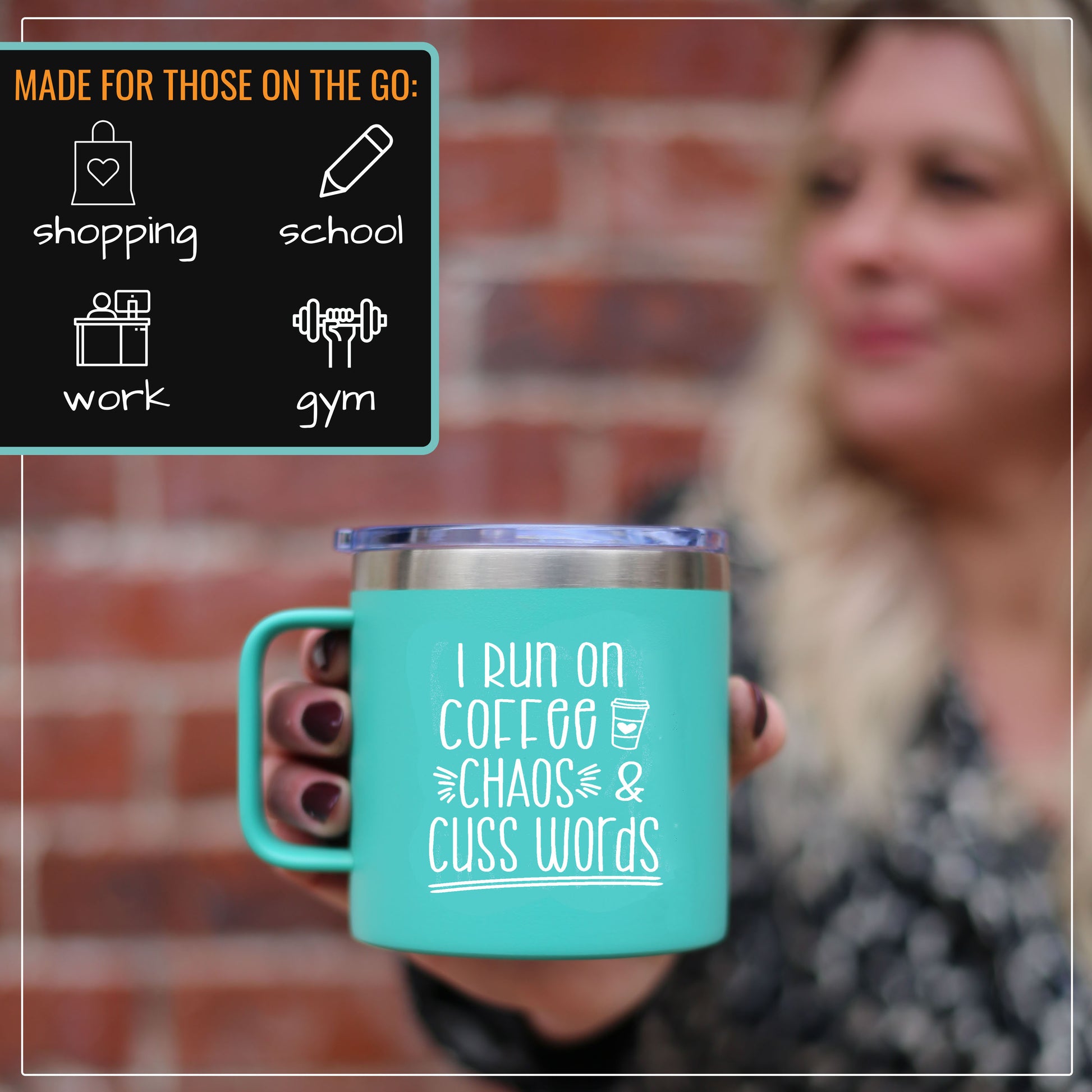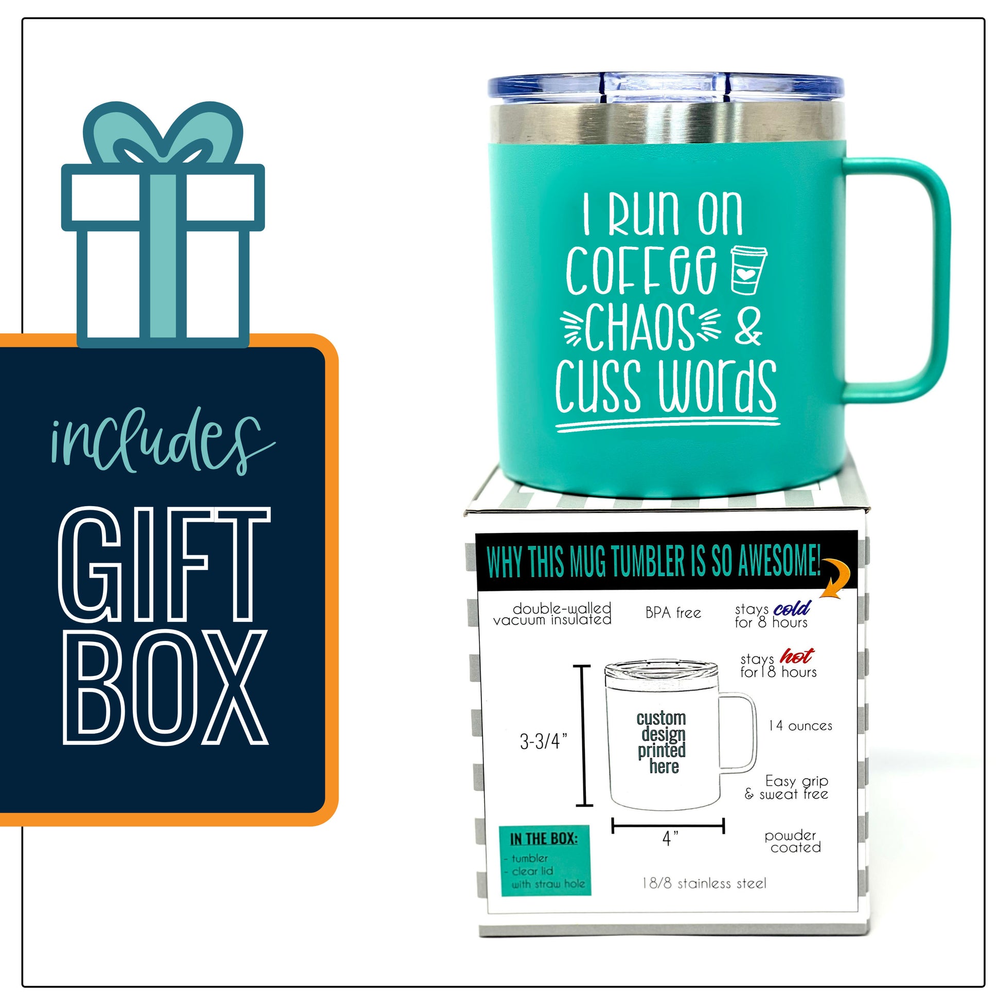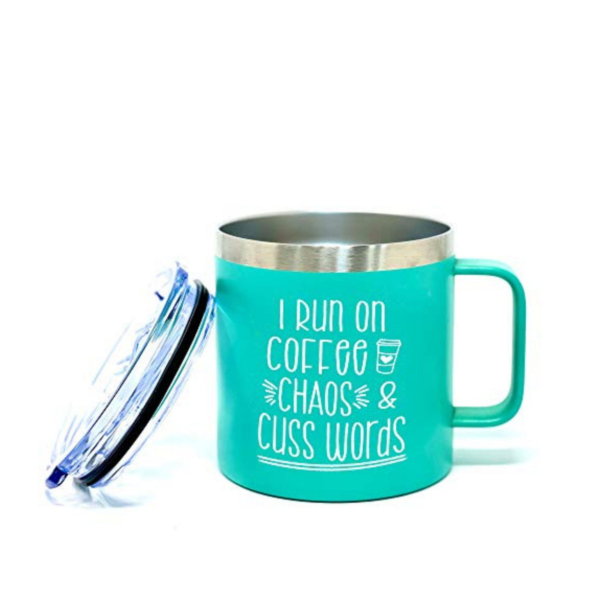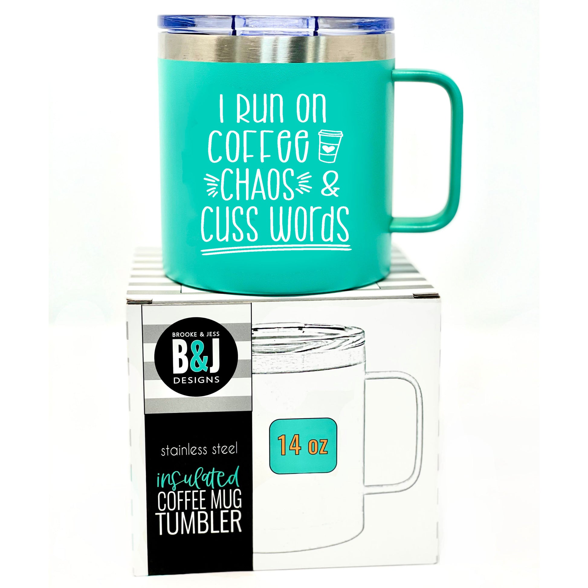 This cute, custom designed, stainless steel coffee mug tumbler is the perfect gift for your favorite woman, girlfriend, boss, coworker, mom, wife and more! Size is 14 oz and it is vacuum insulated so it will keep drinks hot and cold for hours! Coffee Mug travel tumbler is powder coated in the color teal and then the funny saying “I Run on Coffee, Chaos and Cuss Words” is screen printed on front in white print.