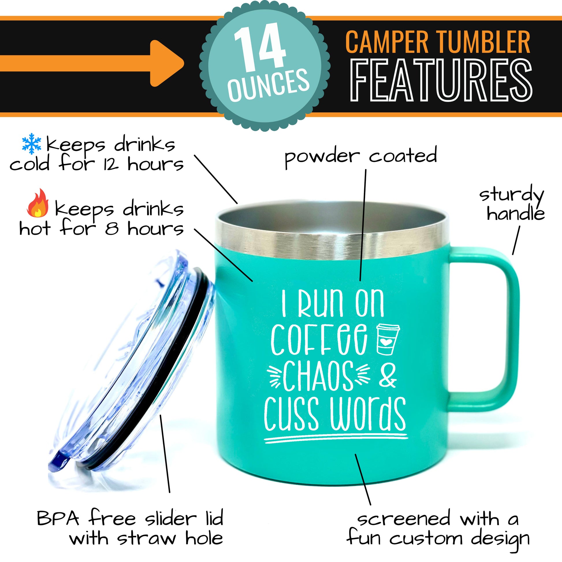 I Run on Chaos, Coffee, Cuss Words 14 oz Teal Camper Tumbler for Bosses