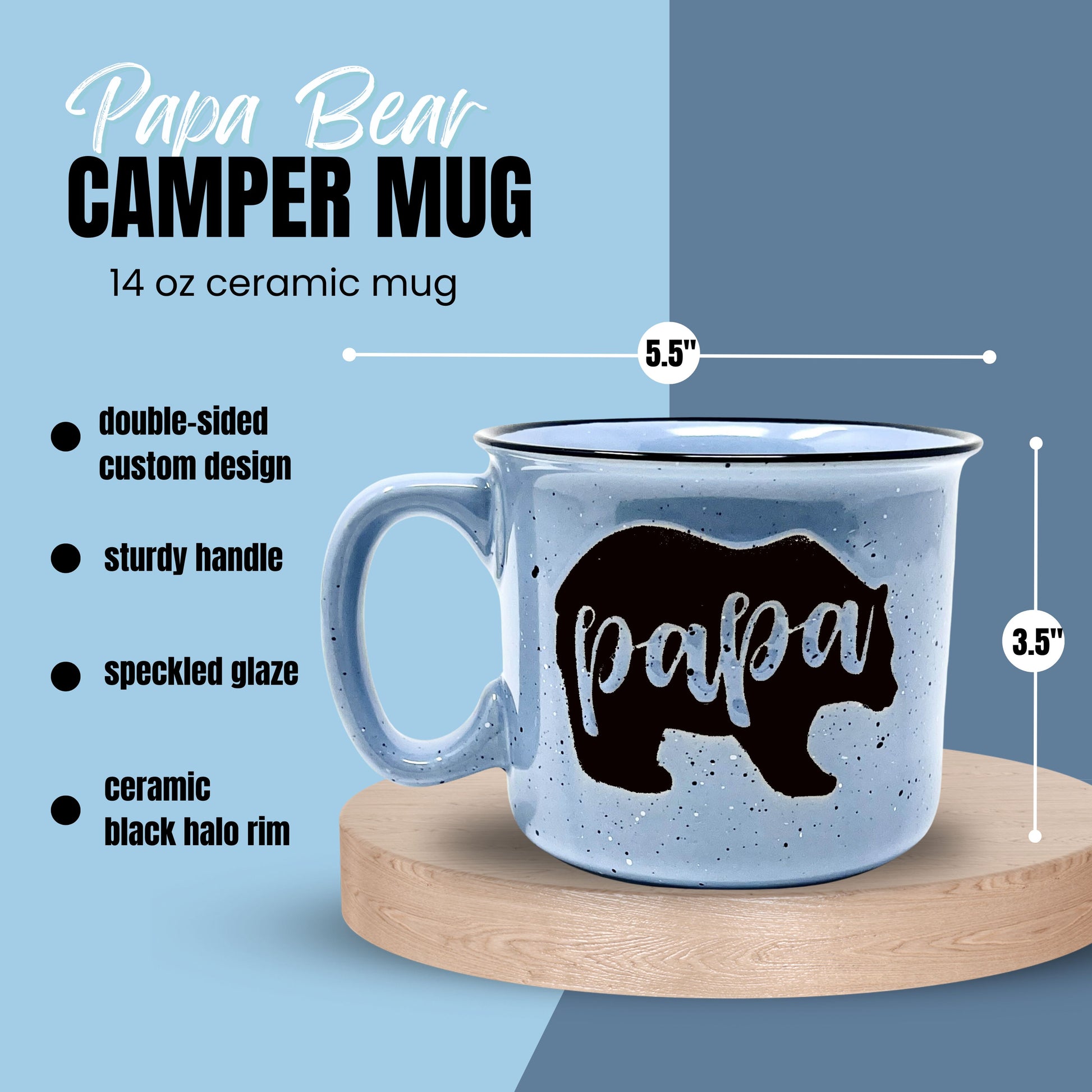 - Large 14 Ounce Coffee Mugs: These cute mugs are larger than most standard size mugs. 14 ounces, 100% colored camper style ceramic mug. Mug made especially for mom or nana is coral colored with "Mama Bear" screen printed in black on the front and back of the mug. Cup made especially for dad or papa is dark blue colored with "Papa Bear" screen printed in white on the front and back of the mug.