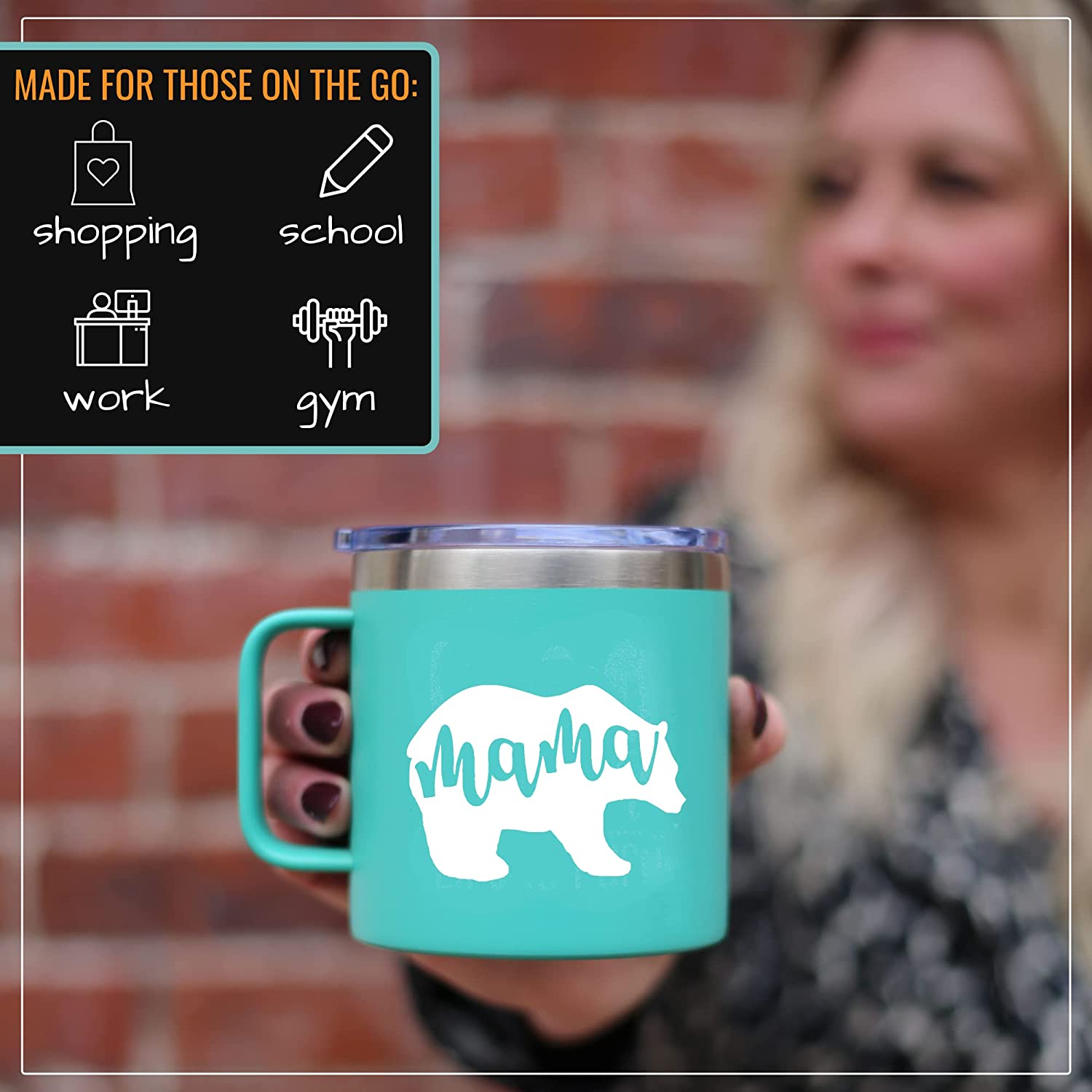 This cute, custom designed, stainless steel coffee mug tumbler is the perfect gift for your favorite woman, girlfriend, boss, coworker, mom, wife and more! Size is 14 oz and it is vacuum insulated so it will keep drinks hot and cold for hours! Coffee Mug travel tumbler is powder coated in the color  teal and then the funny saying “Mama Bear” is screen printed on front in white print. Care instructions: HAND WASH ONLY. Do not use in microwave or dishwasher.