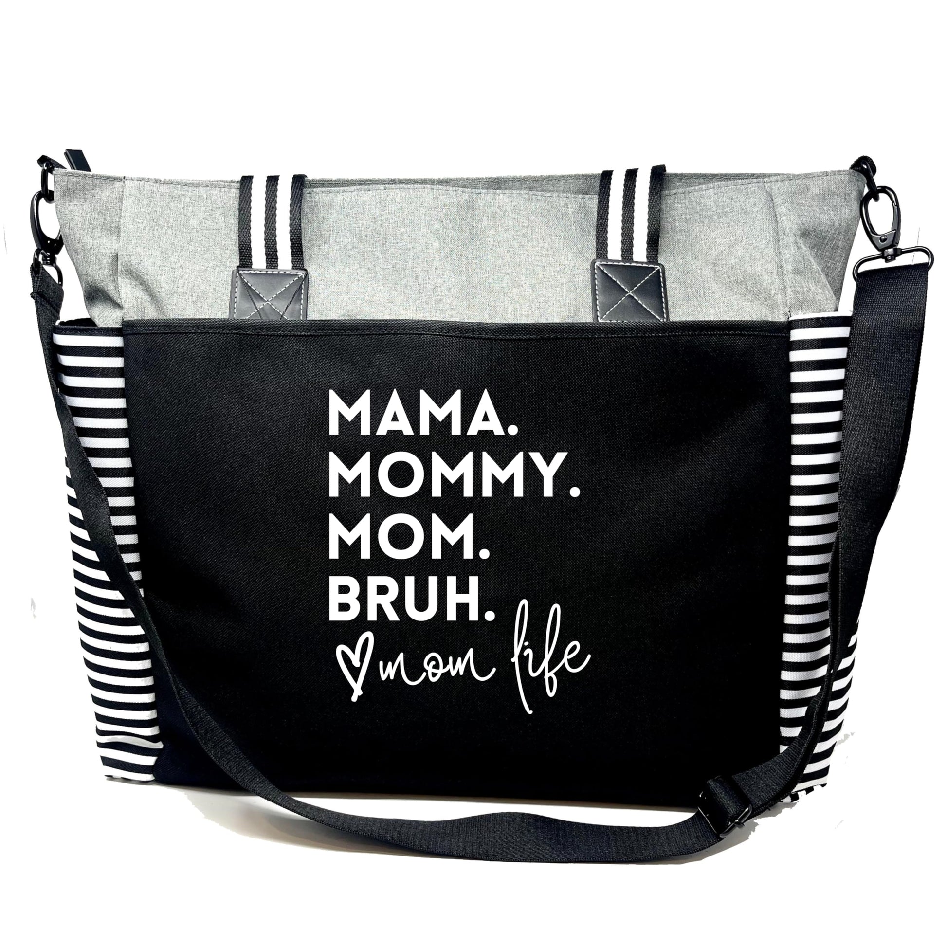 - CUTE, FUN, EXPECTING MOM GIFT - PERFECT BIRTHDAY GIFT FOR MOM: Show your awesome happy mom some love with this momlife totes designed especially for mothers. Has a classy graphic of "Mama. Mommy. Mom, Bruh. Mom life" screen printed on the front pocket of the bag.