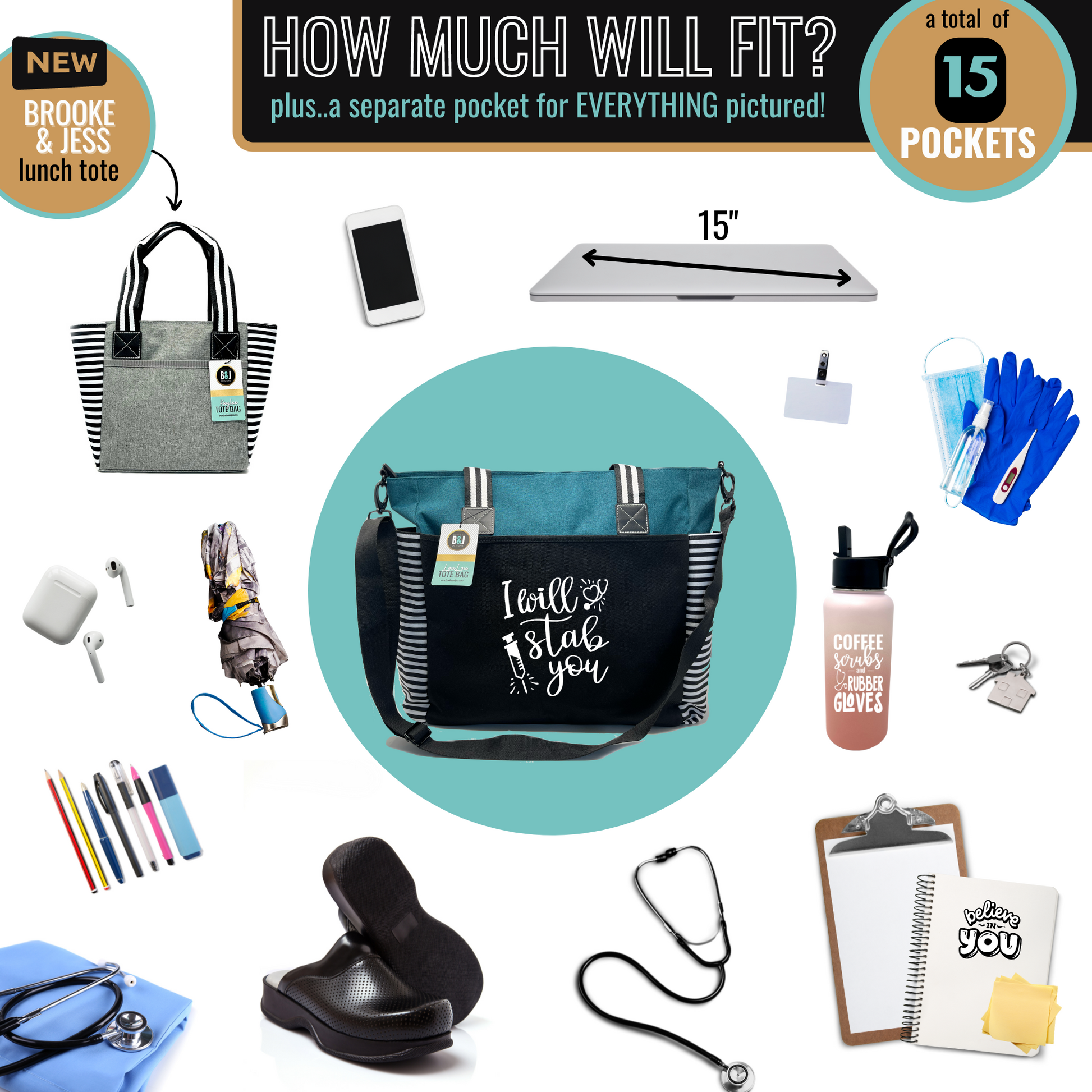 This premium tote bag is made to last with sturdy canvas material and is fully lined inside with cute black and white striped nylon material. Also features a cute, comfy 28” handle, along with a removable and adjustable shoulder strap for ease of carrying!. Strong and comfortable to tote around all of your favorite stuff to nursing school, work or just around town!